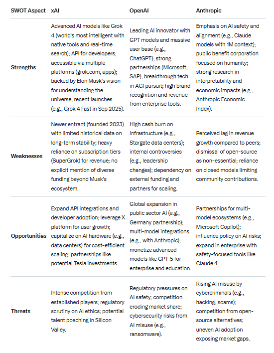 Figure 8: Grok’s SWOT Analysis of xAI and Its Rivals
