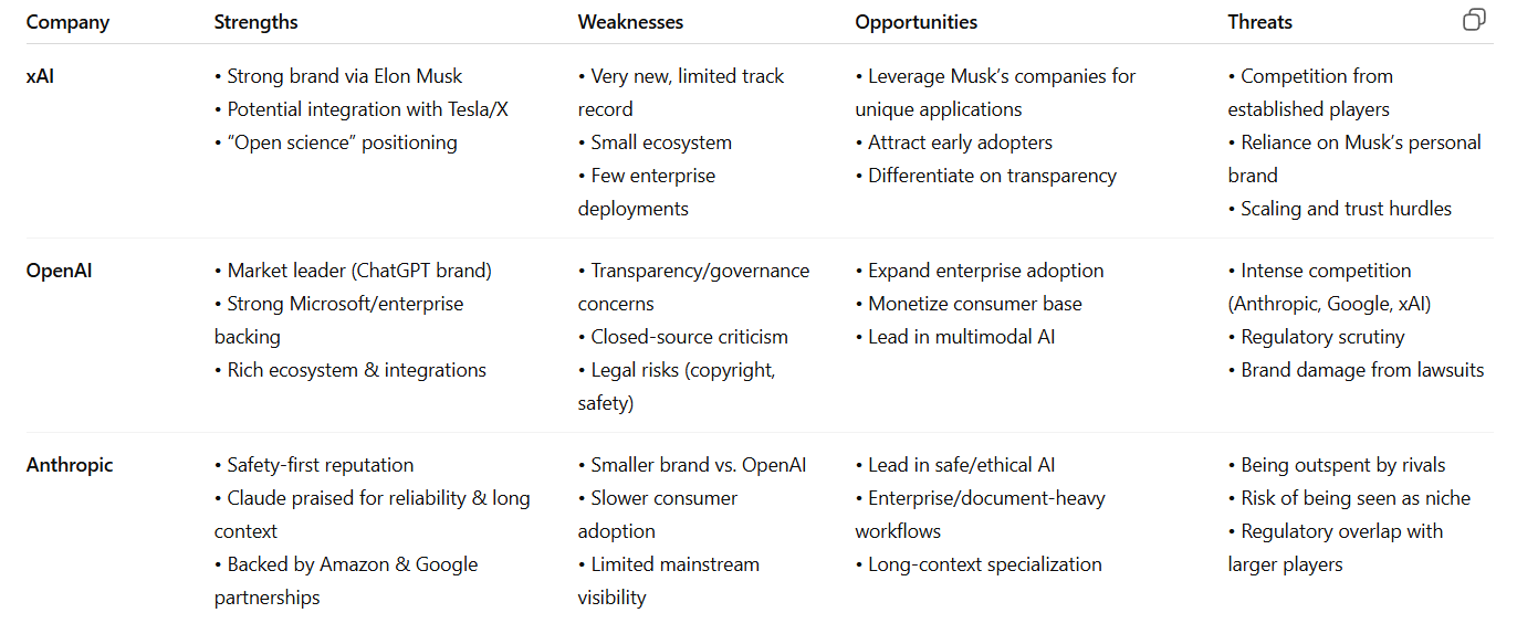 Figure 5: ChatGPT’s SWOT Analysis of xAI and Its Rivals