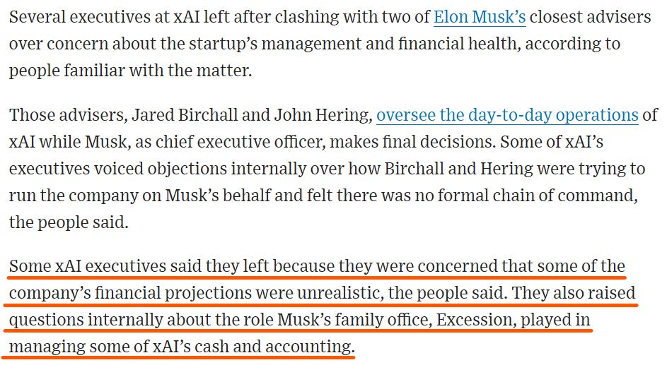xAI’s financials are not to be trusted: As the Wall Street Journal reported last week, some executives quit xAI due to their concerns about unrealistic financial projections and dodgy accounting.