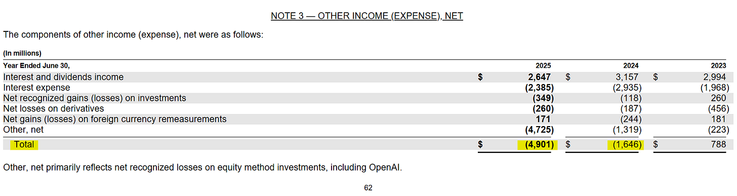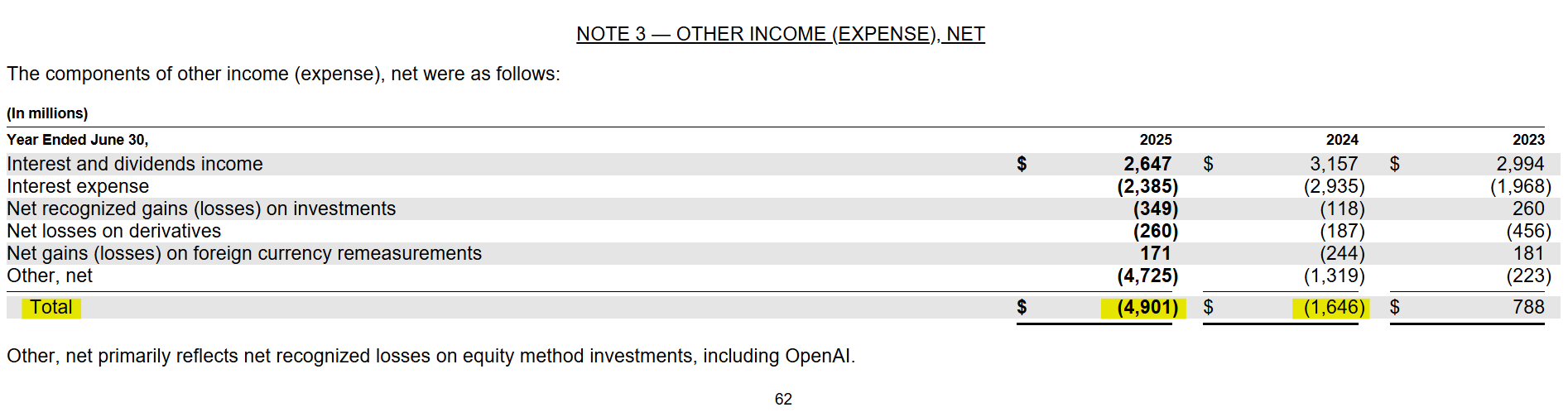 Figure 4 shows Microsoft’s non-operating income accounts from FY2023 through FY2025 (June fiscal year-end). The line item highlighted in yellow mostly includes its equity-method income account, which is its 49% share of OpenAI’s losses.